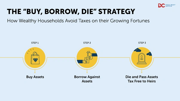 Figure 3: Overview of the “buy, borrow, die” strategy showing how wealthy households legally avoid capital gains taxes across generations [DC Fiscal Policy Institute]