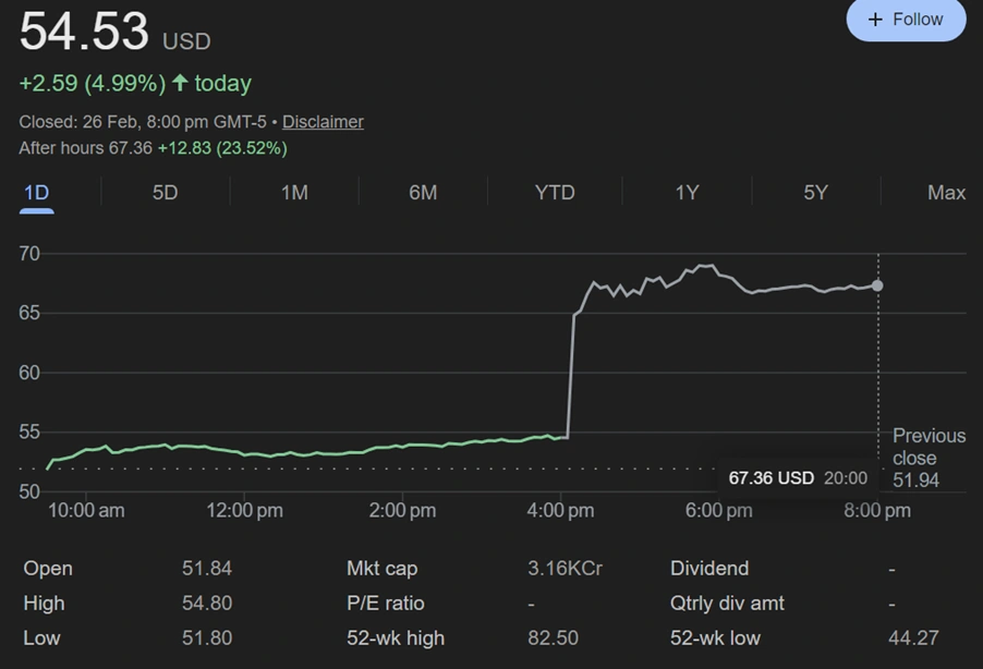 Block shares surged more than 20% in extended hours of trading after the announcement, with the stock having closed the regular session at USD 54.53 per share before the after-hours jump. Some reports put the peak after-hours gain closer to 24%.