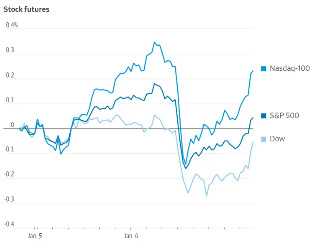 Figure 1: US stock futures movement showing intraday volatility across the Nasdaq-100, S&P 500, and Dow Jones indices. [Source: Wall Street Journal]