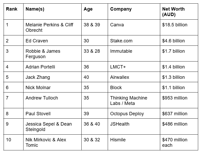 Melanie Perkins and Cliff Obrecht of Canva are the richest with $18.5 billion.