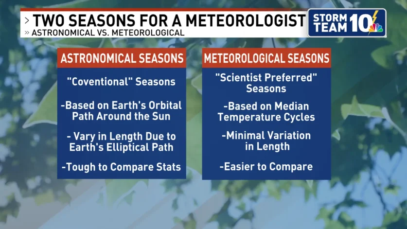 The National Oceanic and Atmospheric Administration (NOAA) states that astronomical seasons rely on Earth’s orbit, whereas meteorological seasons use climate-based cycles.