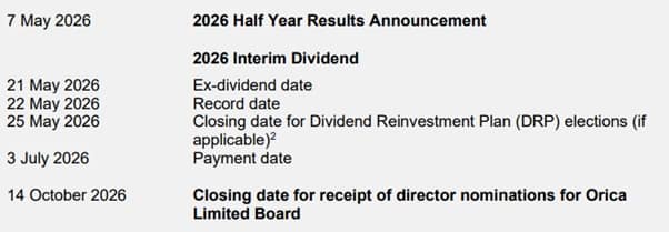 Figure 2: Orica investor calendar 2026 highlighting half-year results, interim dividend milestones, and director nomination deadlines. [Source: Orica]