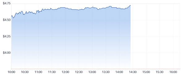 Today’s trading saw a volume of 2.16 million shares, more than double the company’s four-week average of 1 million, with total turnover exceeding $10 million. The price range during the day stretched from a low of $4.42 to a high of $4.73, with strong buying interest evident across all market levels.