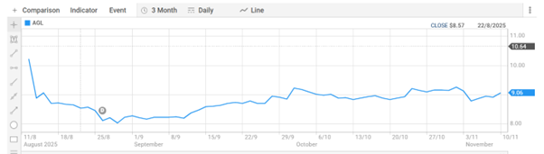 AGL shares trade at AUD 9.060 per share, with the company commanding a market capitalisation of AUD 6.00 billion. The stock has traded within a 52-week range of AUD 8.030 to AUD 12.140 per share. The company supplies around 4.6 million energy, telecommunications and Netflix customer services as of 30 June 2025.