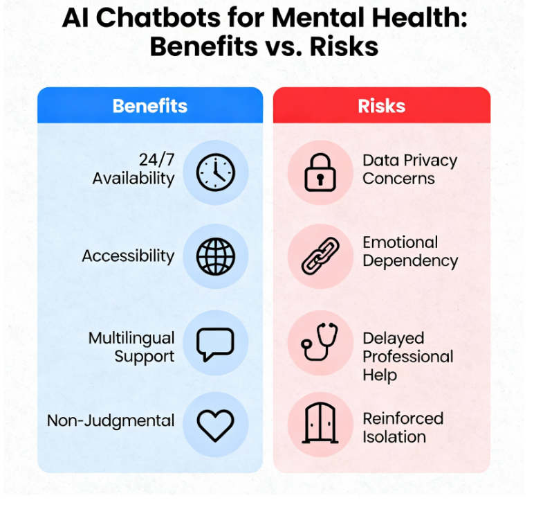 Mental health clinicians acknowledge the dual nature of AI chatbots. While chatbots can increase accessibility to support and offer 24/7 availability, clinicians worry about their limitations. A study from the University of Melbourne involving mental health professionals identified benefits such as helping with homework assignments, multilingual support, and non-judgmental interactions that improve client engagement. However, clinicians also pointed out risks including data privacy concerns, limited understanding of individual client backgrounds, and the potential for clients to rely excessively on AI.