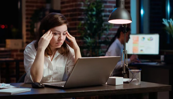 Figure 4: Office worker showing signs of stress and fatigue, illustrating burnout risks linked to extreme work schedules in tech companies. [Source: Freepik]
