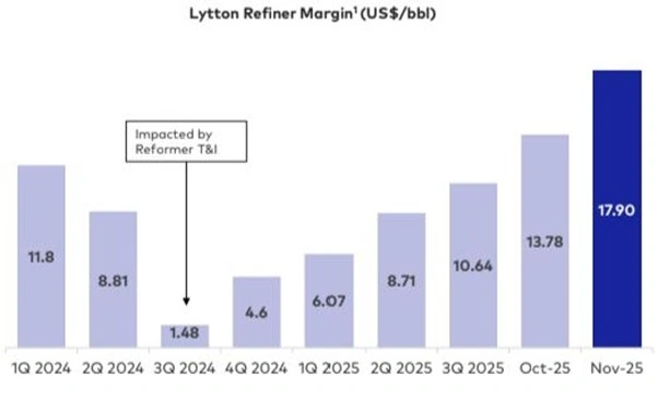 The Lytton refinery was the one that kept the banner up for the whole of the company. It was after the pressure from maintenance work in the first half of the year that margins rapidly improved. The margin set for October at the Lytton refinery orbit (LRM) was US$13.78/bbl and it has gone up further to US$17.90/bbl in November.