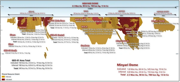 The total Minyari Project MRE comprises 58 million tonnes at 1.45 grams per tonne gold. The resource includes 0.17 per cent copper, 0.42 grams per tonne silver and 0.03 per cent cobalt. These figures combine to deliver 3.3 million ounces of gold equivalent at 1.80 grams per tonne.