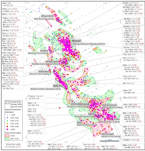 Minella demonstrated similar exceptional growth with a 150 per cent increase from 12,000 ounces to 29,000 ounces. Minyari South recorded 30 per cent growth from 37,000 ounces to 48,000 ounces, remaining open in several directions. Rizzo and GEO-01 South discoveries delivered a maiden Mineral Resource of 24,000 gold ounces with substantial further growth expected.