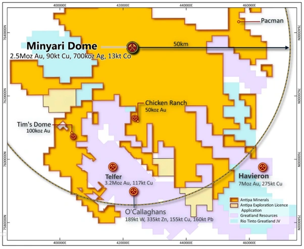 The Minyari Project deposits sit between 10 kilometres and 35 kilometres from Greatland Resources Limited’s Telfer gold-copper-silver mine. Greatland operates a 22 million tonnes per annum mineral processing facility at Telfer. This proximity provides potential processing infrastructure access for future Antipa Minerals mining operations.