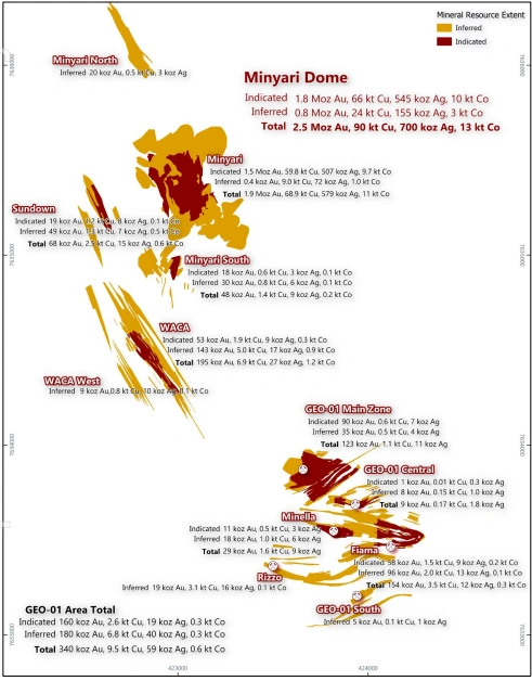 Ans. The updated Minyari development resource totals 3.3 million ounces gold equivalent, comprising 2.7 million ounces gold, 90,000 tonnes copper, 700,000 ounces silver and 13,000 tonnes cobalt.