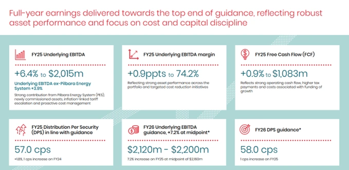 Free Cash Flow for FY25 totalled AUD 1,083 million, representing a 0.9% growth. Distribution per security for FY25 was 57.0 cents, up 1.8% from the previous year. The results demonstrate strong asset performance across the portfolio. Segment revenue for FY25 reached AUD 2,716 million, up 5.2% from the prior year. This revenue growth reflects increased demand for energy infrastructure services across all operational regions.