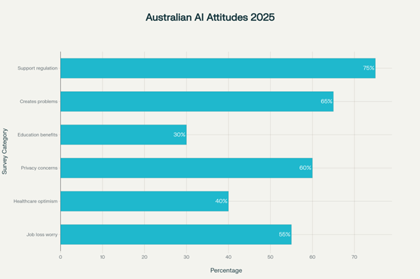 Australians report concerns around job loss, fairness, privacy, and over-reliance on automated systems. Studies reveal that most people are cautious about the social and economic effects of uncontrolled AI deployment.