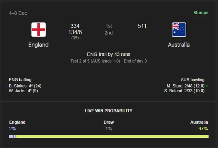 Australia moved closer to a commanding 2-0 series lead on Day Three of the second Ashes Test at The Gabba. Mitchell Starc led the charge with a dominant performance under lights. The hosts finished their innings strongly on 511 runs. England collapsed dramatically in the final session, reaching stumps at 134-6 in their second innings. The visitors now trail by 43 runs with uncertainty mounting.