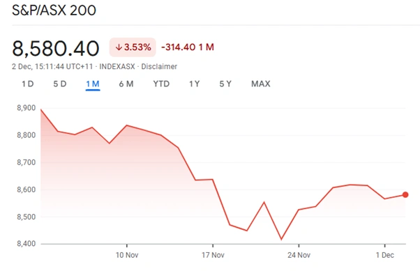 The Australian share market faced renewed pressure on Tuesday. Investors reacted to negative leads from international markets. The benchmark S&P/ASX 200 Index dropped during the session. It fell to 8,538 points in afternoon trade. This represents a loss of 0.32 per cent. The market extended its declines from Monday’s session. Global sentiment remains fragile entering December.