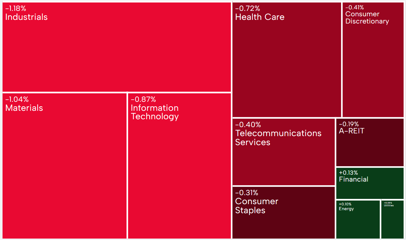 The broader sector breakdown, reflected in today’s market heatmap, shows widespread weakness. Industrials led the declines, falling 1.18%, followed by Materials and Information Technology, which dropped 1.04% and 0.87%, respectively. Only a few sectors, such as Financials (+0.13%), Energy (+0.10%), and Utilities (+0.05%), posted marginal gains.