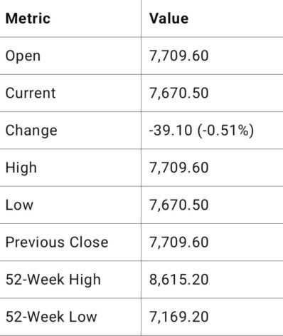 According to technical analysts, the 7,660 level serves as an immediate support for intraday trades. A breakdown below this threshold could see the index test further support around 7,630. On the flip side, resistance is expected near 7,700, with a more solid ceiling at 7,740.