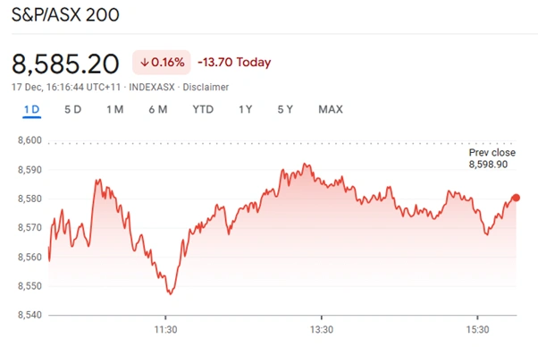 Australian equities slipped into negative territory on Wednesday as investors braced for potential interest rate hikes. The S&P/ASX 200 index declined 0.42% to close at 8,598.9 points on Tuesday’s trading session. The broader All Ordinaries index also retreated, shedding 43.2 points to finish at 8,880.6 points. Market participants faced mounting uncertainty surrounding Reserve Bank monetary policy decisions in 2026.