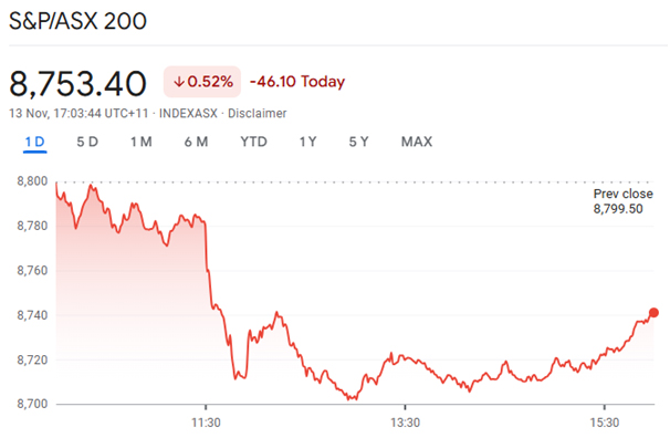 The S&P/ASX 200 ended the session lower on Thursday, 13 November 2025, following a sharp reaction to stronger-than-expected Australian labour force data that pushed back rate cut expectations. The benchmark index drifted lower through the afternoon and settled near its intraday lows, tracking plays seen across global markets earlier in the week.