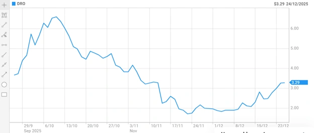 ASX:DRO trades at $3.300, up 0.917% today with volume hitting 20.4 million shares. The stock shows a strong YTD rally and noted upward trend in its 52-week range.
