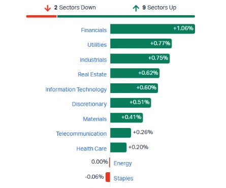 Local sentiment saw a bounce off strong breadth, aided by more than 77% of ASX-listed stocks recording either a flat or positive close for the day. Big miners such as BHP climbed +0.7%, with Rio up +0.5%. This collective push across sectors has positioned the ASX 200 close to surpassing its previous record of 7,849.8, set earlier in the week.