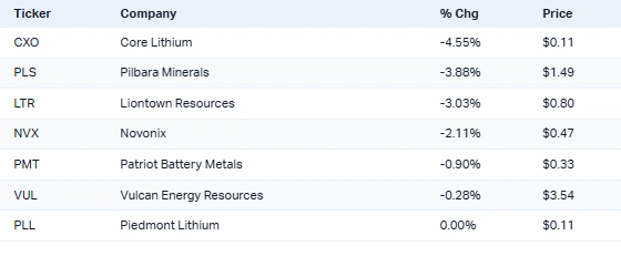 Lithium sector dips as oversupply fears grow amid slowing global demand and weaker Chinese EV output.