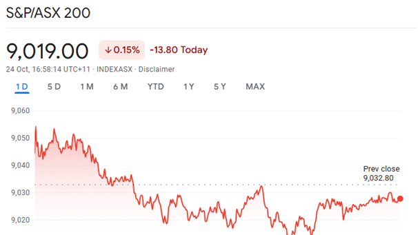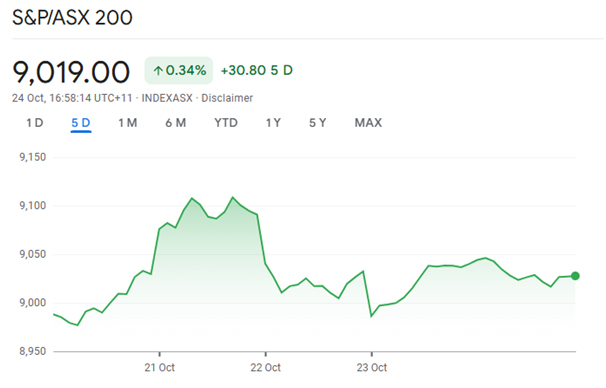 Australia’s main stock market index, the ASX 200, stands at 9,019 points after closing on Friday, October 24, 2025, losing 0.15% from the previous session. The index climbed 2.8% over the past month and is up 9.84% compared to this time last year. Investor sentiment is buoyed by strong macroeconomic factors and sector performance.