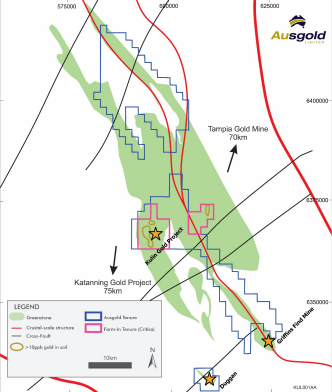 Map showing Ausgold’s Kulin farm-in tenement (E70/5077) near Katanning gold project and Tampia gold mine, along Yandina Thrust.