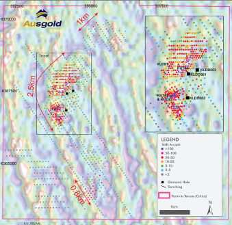 Soil gold anomaly map within E70/5077 showing high-priority targets, trenching, and drill hole locations in Ausgold’s Kulin farm-in area.