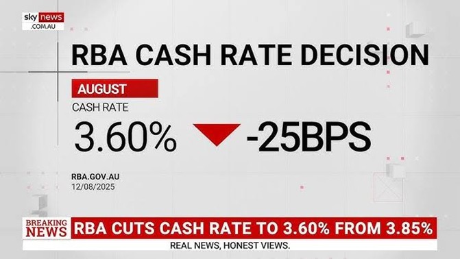 RBA cuts cash rate to 3.60% in August 2025, easing borrowing costs.