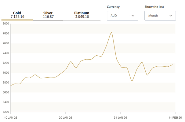 Investors in Australia monitor the prices of gold and silver in February 2026. Data from the Perth Mint shows gold trading at $7,149 per ounce. Silver maintains a price of $116 per ounce on the spot market. These figures reflect a shift in the bullion sector over the last month. Market participants compare these two assets to determine the allocation of capital.