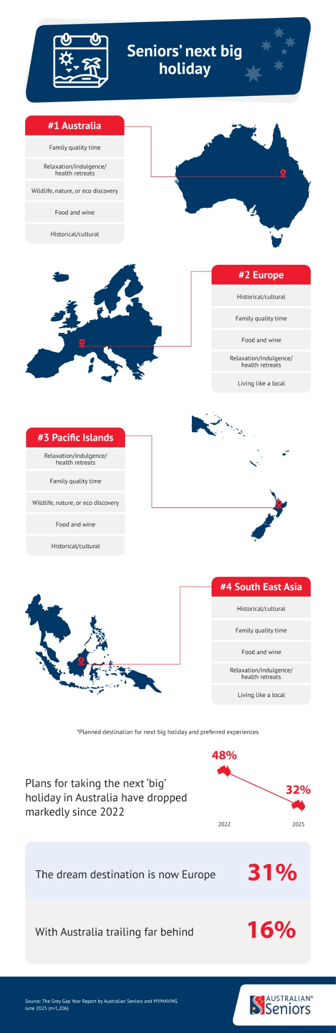 The Grey Gap Year Report 2025 shows seniors are taking control of retirement by travelling widely. They balance financial realities with long-term aspirations for memories and connection. The trend marks a new retirement model for Australians. Seniors are choosing adventure, prioritising shared moments, and proving travel remains central to a fulfilling life.
