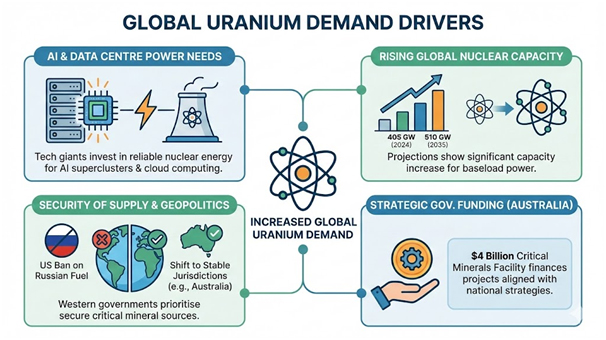 The market enters 2026 with renewed momentum and strategic tailwinds. Demand from major economies like China and India continues to grow. These nations seek low-carbon energy to meet decarbonisation goals. Australian uranium supports the global transition to clean power. The combination of rising demand and constrained supply creates long-term opportunities. Australia remains a cornerstone in the global nuclear energy mix.