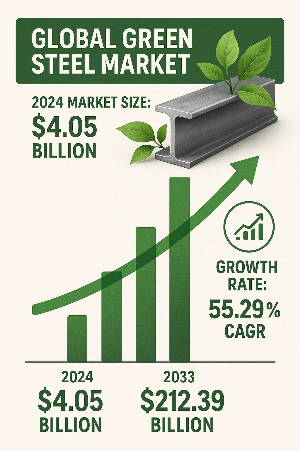 The timing couldn’t be better. Global green steel market forecasts show explosive growth.