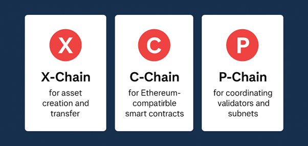 Avalanche is built around a three-chain architecture that enhances efficiency and scalability across different blockchain functions. These chains—X-Chain, C-Chain, and P-Chain—work in harmony without overloading a single network.