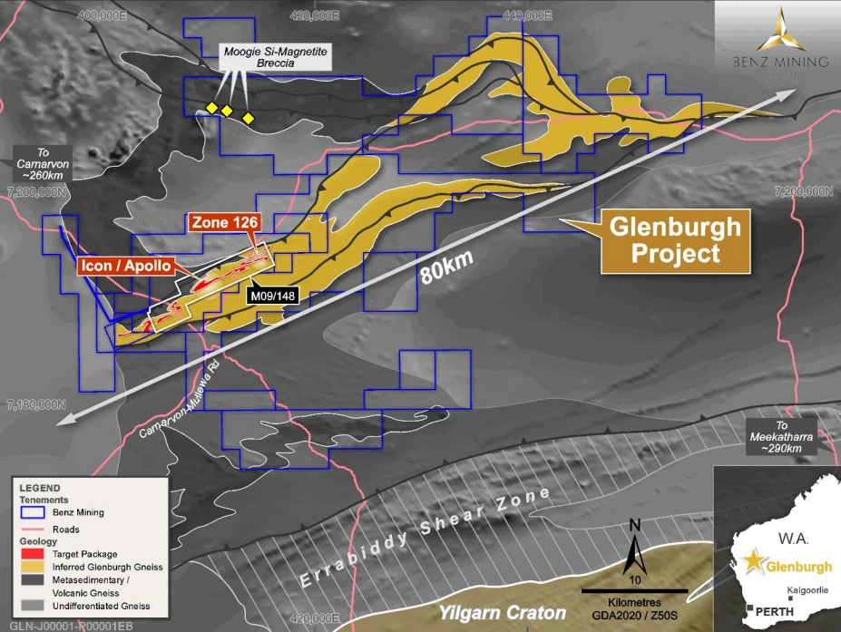 Glenburgh’s Zone 126 represents less than one third of the entire mineralised corridor. Strong potential exists for additional parallel, blind discoveries across the trend. Two drill rigs remain active on the Apollo Icon trend defining its bulk tonnage potential. Benz Mining is ramping up exploration with new rigs to scout further targets along the entire 18 kilometre corridor.