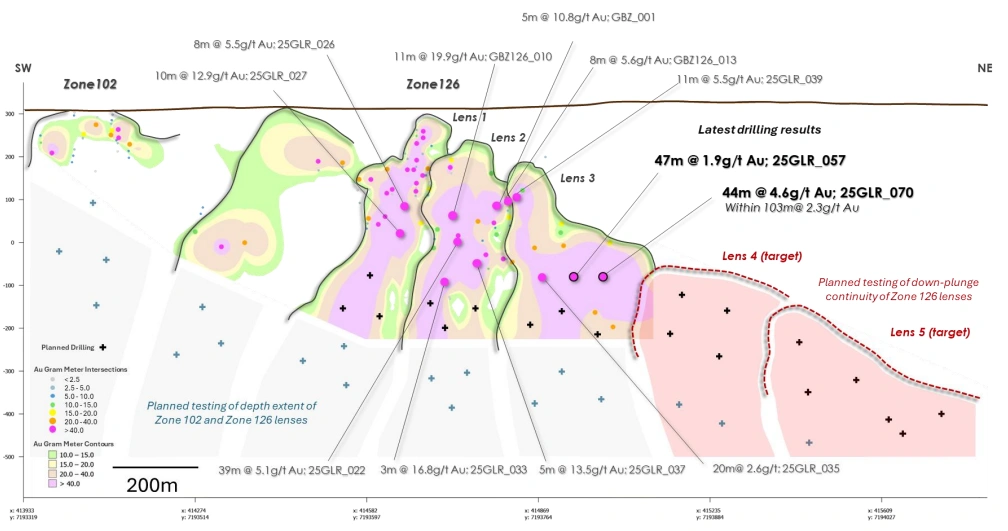 Benz Mining has three rigs onsite, with a fourth arriving in coming weeks. The company continues to drill and extend high grade intercepts at Zone 126. Exploration aims to define and extend the existing lenses and target further discoveries along the northeast trend. The current focus includes the new target positions for lenses four and five.