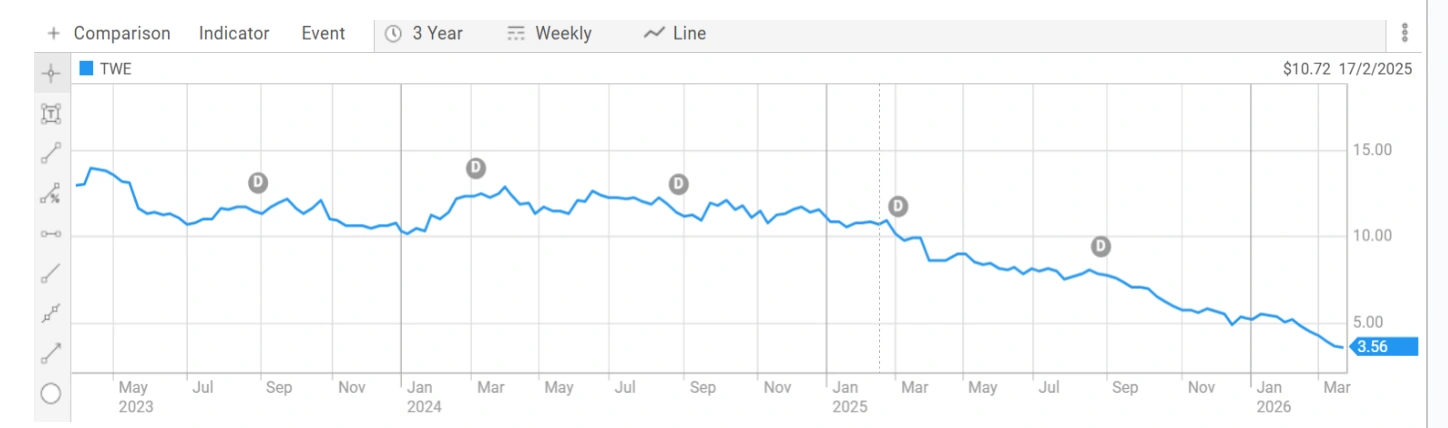 Figure 4: Treasury Wine Estates Limited (ASX: TWE) share price performance chart highlighting extended price weakness [Courtesy: ASX]