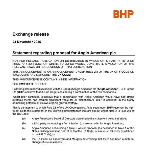 BHP Group Ltd announced on 24 November 2025 that it is no longer considering a combination with Anglo American plc. After preliminary discussions with Anglo American’s board, BHP confirmed it will not pursue a merger or acquisition deal. The Company continues to recognise the strategic merits and potential value such a combination could have created. However, BHP emphasised its confidence in its own organic growth strategy moving forward.