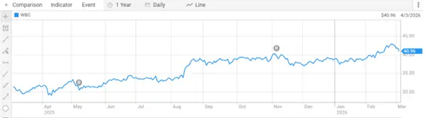 Figure 4: Westpac Banking Corporation (ASX: WBC) one-year share price trend reflecting steady growth in bank stocks [ASX]