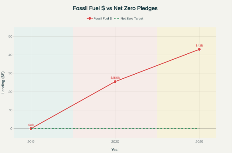 The banks reiterated their commitment to reach net zero emissions by 2050. They claimed they would align lending with pathways to a maximum temperature rise of 1.5°C above pre-industrial levels. However, records show billions earmarked for fossil fuel expansion projects have continued. The lending took place between the signing of the Paris Agreement and the present.