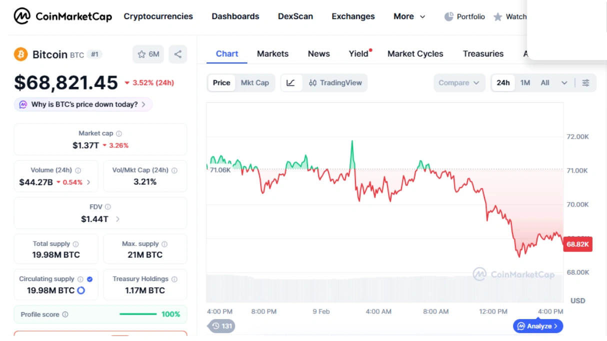 Bitcoin fell to $59,930 before stabilizing near the $69,000 range during Binance’s SAFU conversion period. [CoinMarketCap]