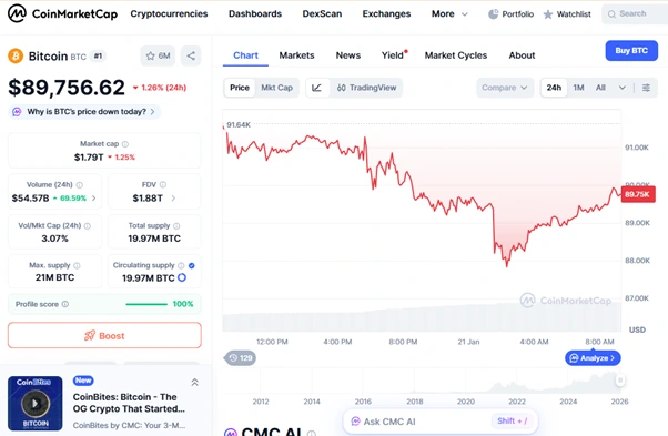 Bitcoin was trading at $89,769 at the time of reporting, down over 2% on the day. The flagship crypto had earlier climbed toward $93,000 before sellers regained control and pushed prices lower.
