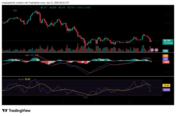 A Bitcoin daily chart with RSI and MACD indicators showing weakening momentum and range-bound price action. (Source: TradingView)