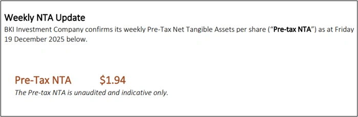 Ans. BKI Investment Company Limited NTA stands at AUD 1.94 per share on a pre-tax basis as at 19 December 2025. This represents the underlying asset value per share before deferred tax provisions.