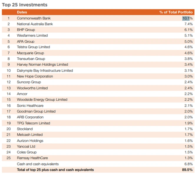 Commonwealth Bank represents the largest holding at 10.1% of the portfolio. National Australia Bank accounts for 7.4% of total investments as at 30 June 2025.