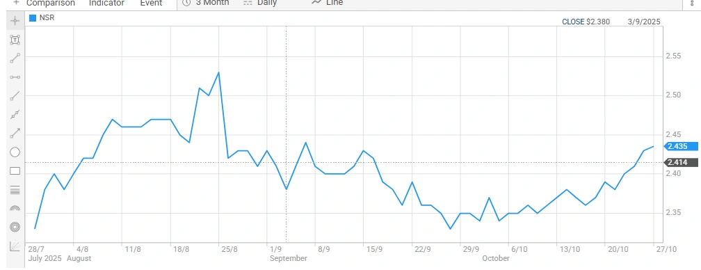 As of the latest session, NSR shares traded at $2.435, up 0.205%, with a market capitalisation of $3.41 billion and daily volume of 952,095.