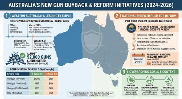 Western Australia has recently demonstrated the effectiveness of modern buyback approaches. Almost fifty-two thousand guns have been surrendered across three phases of their voluntary firearm buyback program. This represents the biggest removal of firearms anywhere in Australia since nineteen ninety-seven.