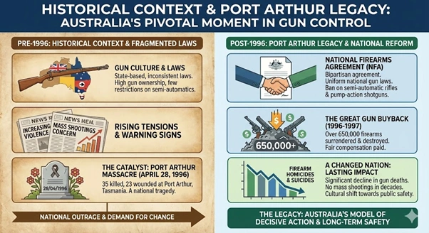 The Port Arthur massacre occurred in April nineteen ninety-six when a gunman killed thirty-five individuals. This tragedy fundamentally transformed Australia’s approach to firearm safety and regulation. The National Firearms Agreement followed within two weeks of that event.