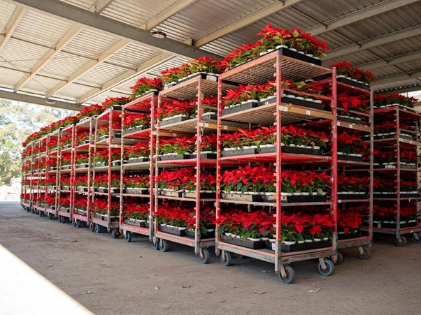 Growing Christmas poinsettias demands meticulous year-round planning and execution. “From growing mother stock, to the delivery of small plugs ready for potting mid-June through to mid-August to meet our delivery dates for Christmas,” Sheldon-Collins explained. The timeline extends across the entire calendar year without interruption.